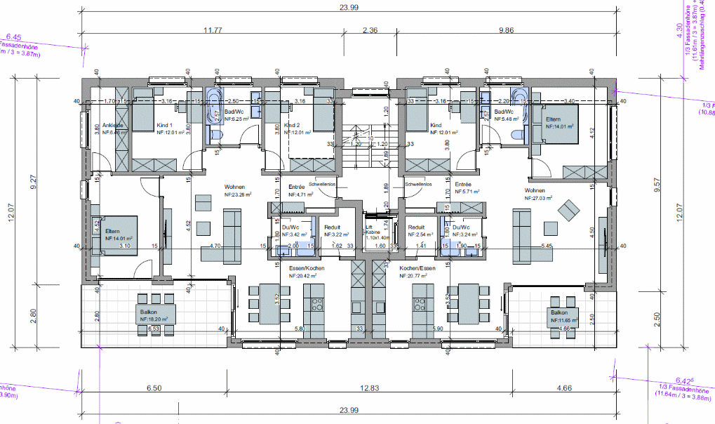 Wohnungstrennwände in Die Treppenläufe und Podeste aus vorfabrizierten Betonelementen. Das Treppenhaus wird mit Platten belegt. Treppenuntersichten gestrichen. Bei den Balkonen im Erd-, Ober- und Dachgeschoss wird eine Flachdachabdichtung mit Gehwegplatten ausgeführt. Balkongeländer aus Alumiumfüllungen